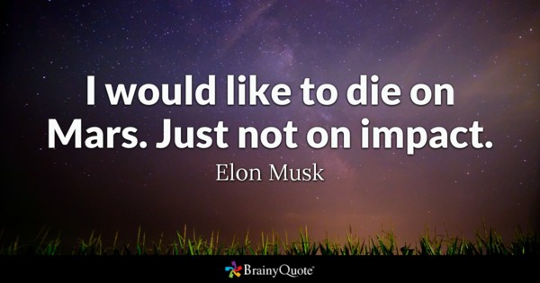 This quote is one I want to share because it not only made me laugh, it reminded me of how important it is to enjoy the journey. Anyone who knows about Elon Musk, knows that all of his life’s work with Tesla, solar power, and, of course, Space X is all for to get humans to Mars. We all have a Mars we are working towards: retirement, promotion, new car, etc and we can focus on that end goal so much that we ignore everything else going on around us. We sacrifice time with loved ones or put off other fun things and justify it by saying we will do that stuff after we reach our goals. The problem is, the journey is what makes the goal sweeter, not the goal itself.